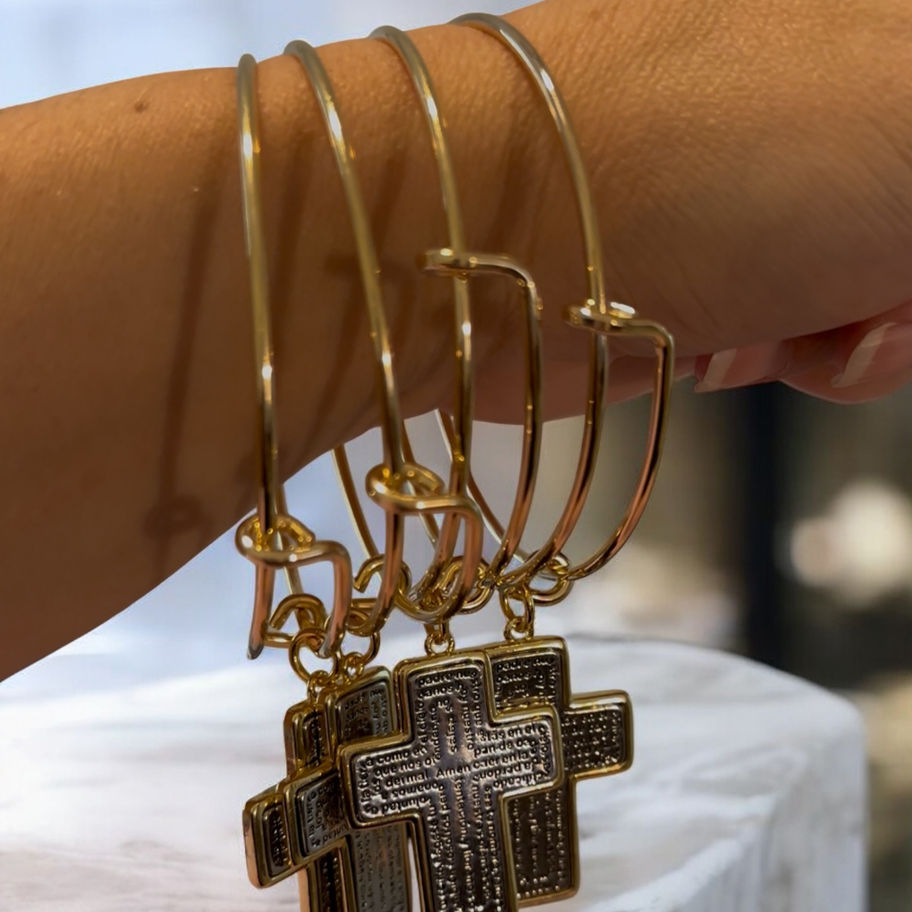 Timeless and meaningful, this bangle bracelet features a bold cross pendant that symbolizes faith and strength. Crafted with a golden finish, it is lightweight, durable, and perfect for everyday wear. The adjustable single-size design ensures a comfortable fit for most wrists. A powerful accessory that adds elegance and spiritual significance to any outfit.